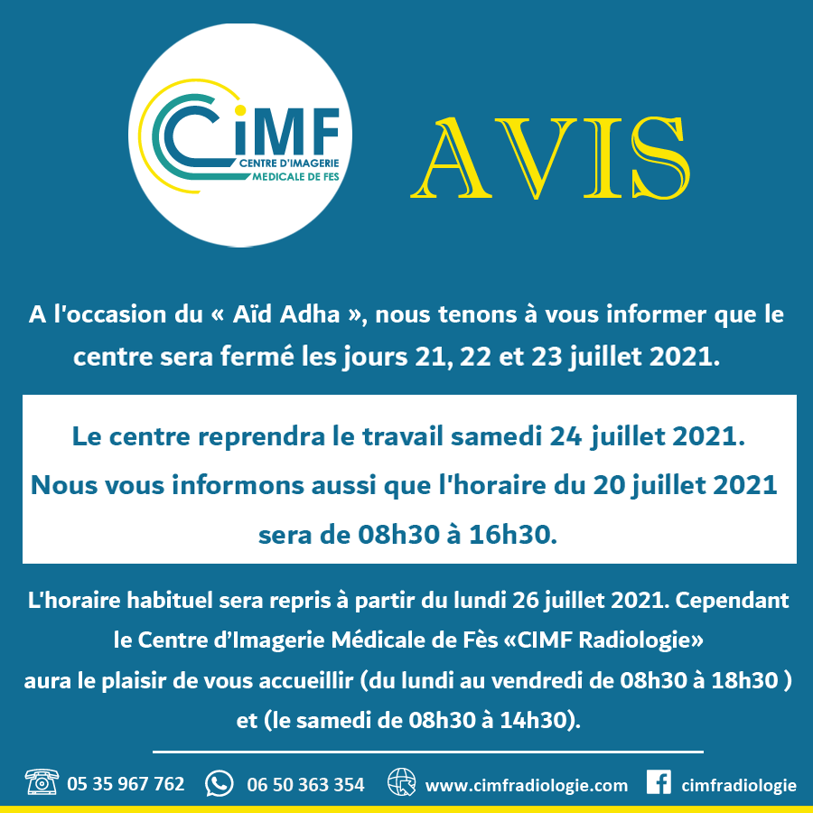 À l’occasion du «Aïd Adha», nous tenons à vous informer que le centre sera fermé les jours 21, 22 et 23 juillet 2021. Le centre reprendra le travail samedi [...]