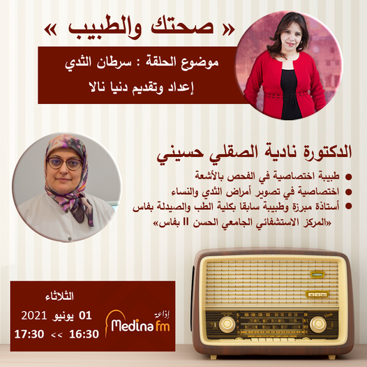 📻 MEDINA FM صحتك والطبيب، برنامج أسبوعي براديوDounia NALA إعداد وتقديم دنيا نالاسرطان الثدي موضوع حلقة يوم الثلاثاء 01 يونيو 2021ضيفة الحلقة الدكتورة نادية الصقلي حسيني طبيبة اختصاصية في [...]
